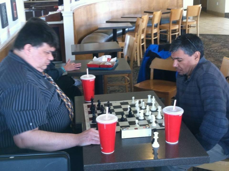 P.S. Had fun playing chess last weekend at Jeff Baffo's "Chess Flash Mob" at Wendy's in the Denver Tech Center. Here is a picture of my buddy Francisco playing Jeff taken by Rob Hartelt. Francisco is famous for his fishing pole win over Walter Browne in a simul in Reno a few years ago. Brian Wall calls him a "living legend" :)
